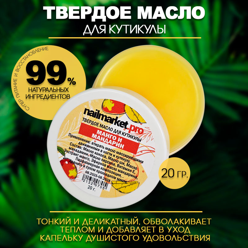 Это средство для профессионального ухода для ногтей и кутикулы с уникальным редким маслом манго поможет быстро и эффективно восстановить тонкие слабые поврежденные ногти и моментально смягчит грубую кожу вокруг ногтей. Твердое масло воск моментально впитывается, в отличие от классическго масла для кутикулы не оставляет жирной пленки и липкости.